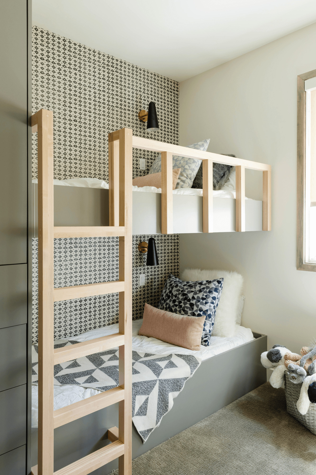 Railing design and wallcoverings are two ways to add personality and make a room feel unique. An eye-catching wallpaper can set the tone for the whole room, while another way to create impact and personalize a bunk room is the railing design. Contrasting colors or patterns in wood or metal can layer in for more visual interest.