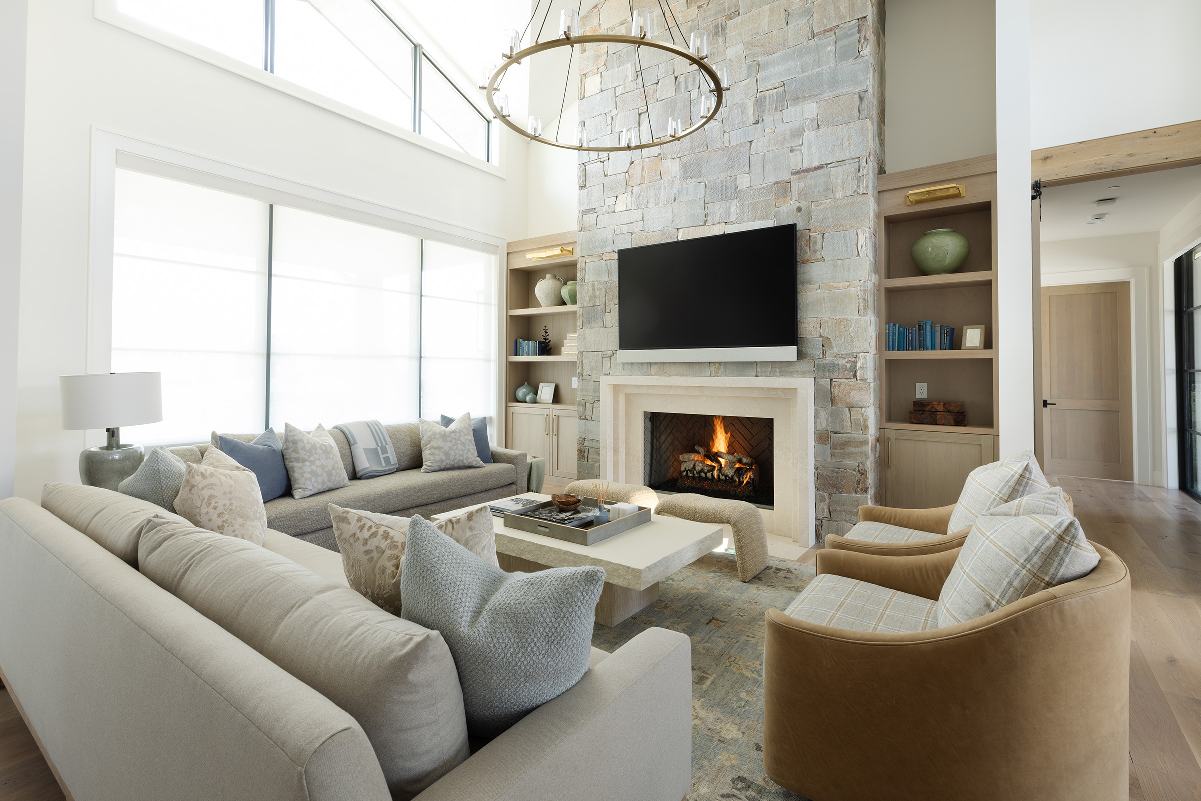 This relaxed and cozy main living space oozes timeless elegance, with exquisitely crafted millwork and decorative niche cabinetry flanking the stone fireplace for added character and warmth. Sophisticated furnishings offer ample and comfortable seating, inviting intimate conversation in a serene neutral palette accented with subtle textiles and soft hues. The custom designed round dining table creates a smooth transition between the kitchen and formal seating area, providing a relaxed space to enjoy meals with family and friends. The overall design effortlessly blends comfort with refinement, making it the ideal space for both relaxation and gathering.