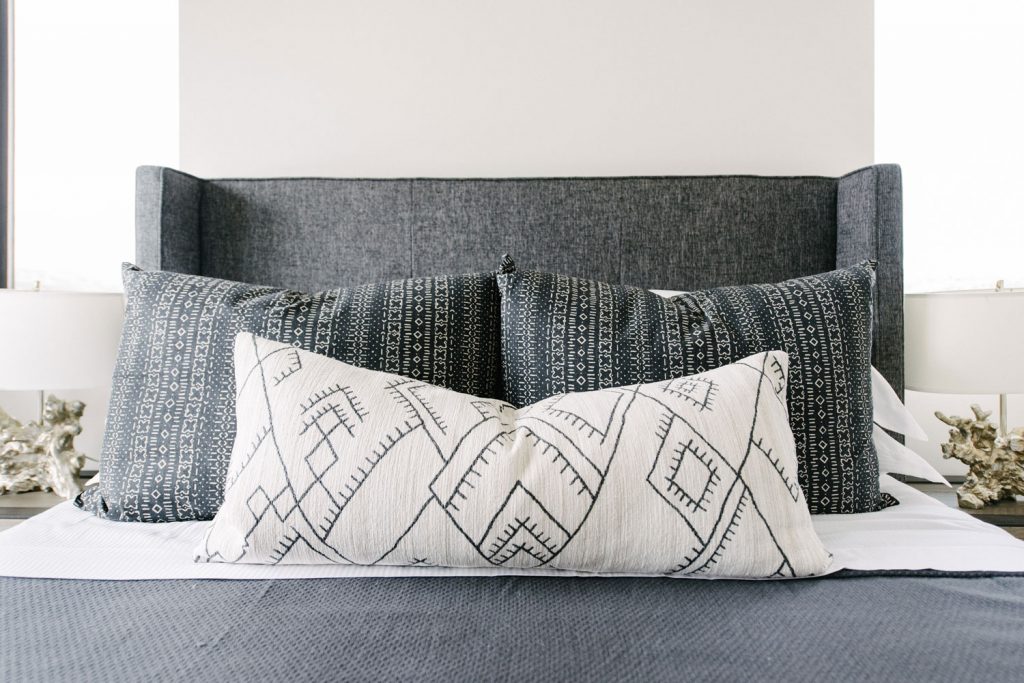 In modern design you still have room to play with color and texture, while still keeping it minimal and contemporary. By only using 4-5 pillows total on your bed, you’ll be able to add interest while keeping within your style. Remember these tips to keep it easy 1) You can use odd numbers or even, it just depends on how minimal you’d like to be or how much you’d like to add to achieve your look. Don’t be afraid to play and see what looks right! 2) Change up textures to keep it interesting. Add a large print and a small print or plain with texture. Just keep it varied and you will be happy with the outcome. 3) Think about the filling. For a more luxe feel and the ability to do the “karate chop” pillow look keep it to down or faux down. For more structure and support go for the regular fill.