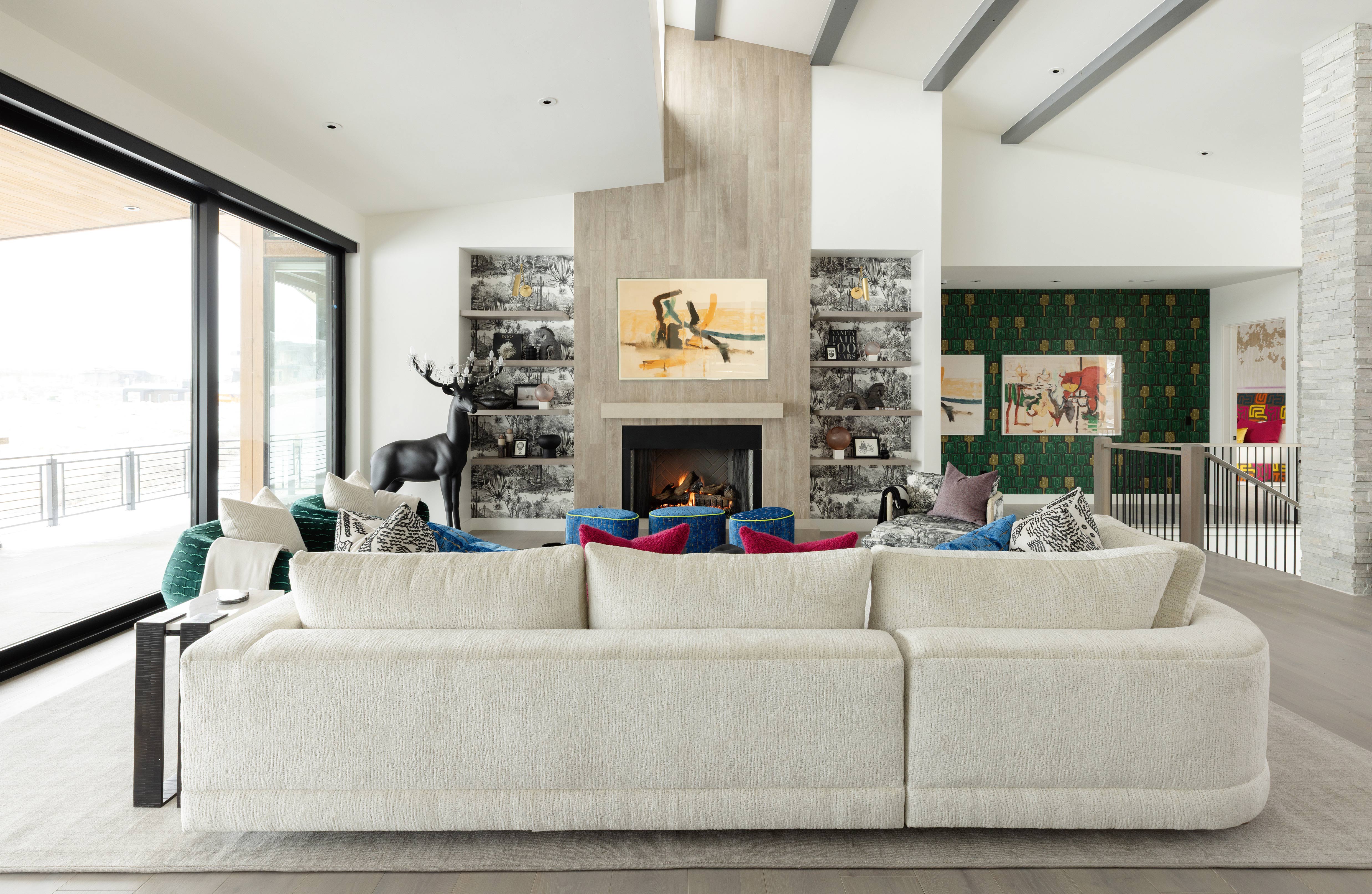 This refined home blends refined elegance with bold, playful details. Neutral backdrops let rich textures, patterned wallcoverings, and curated art take center stage, while whimsical touches like Pierre Frey’s tiger motif chairs and blue hair-on-hide legs add unexpected character. Vibrant accents flow throughout the living spaces, anchored by cream velvets, marble, and layered lighting that shift mood and tone. Each bedroom carries its own personality—serene neutrals in the primary suite, graphic textiles in the guest rooms, and charmingly colorful touches in the kids’ spaces.