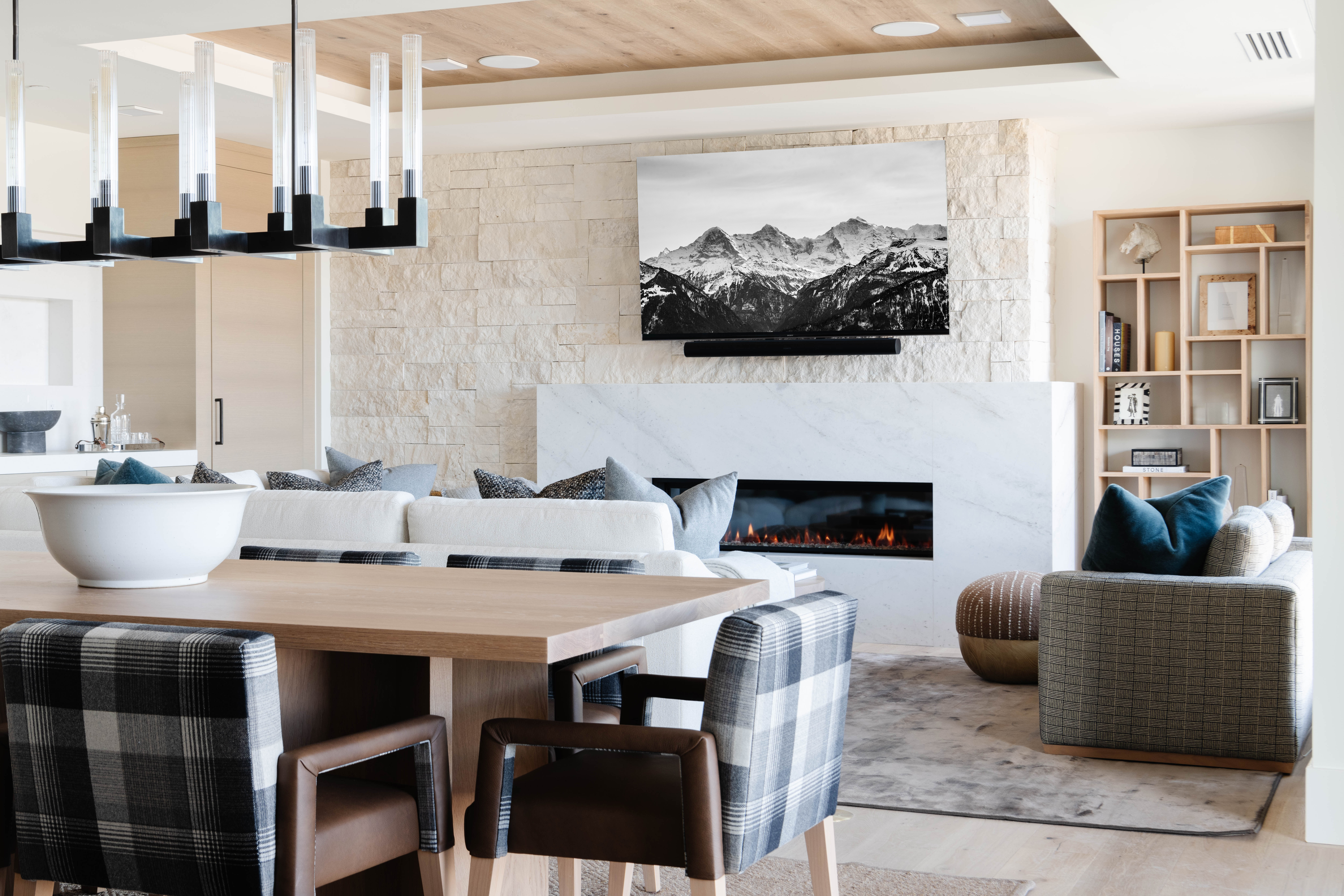 Evoking those warm, mountainside lodge vibes, this ski retreat sports cozy plaid textiles from the walls to the upholstery alongside luxurious velvets and nubby boucles. Juxtaposed to these sumptuous grounds are natural woods, raw stones and marbles that bring textural contrast into each room—creating some serious mood and impact.