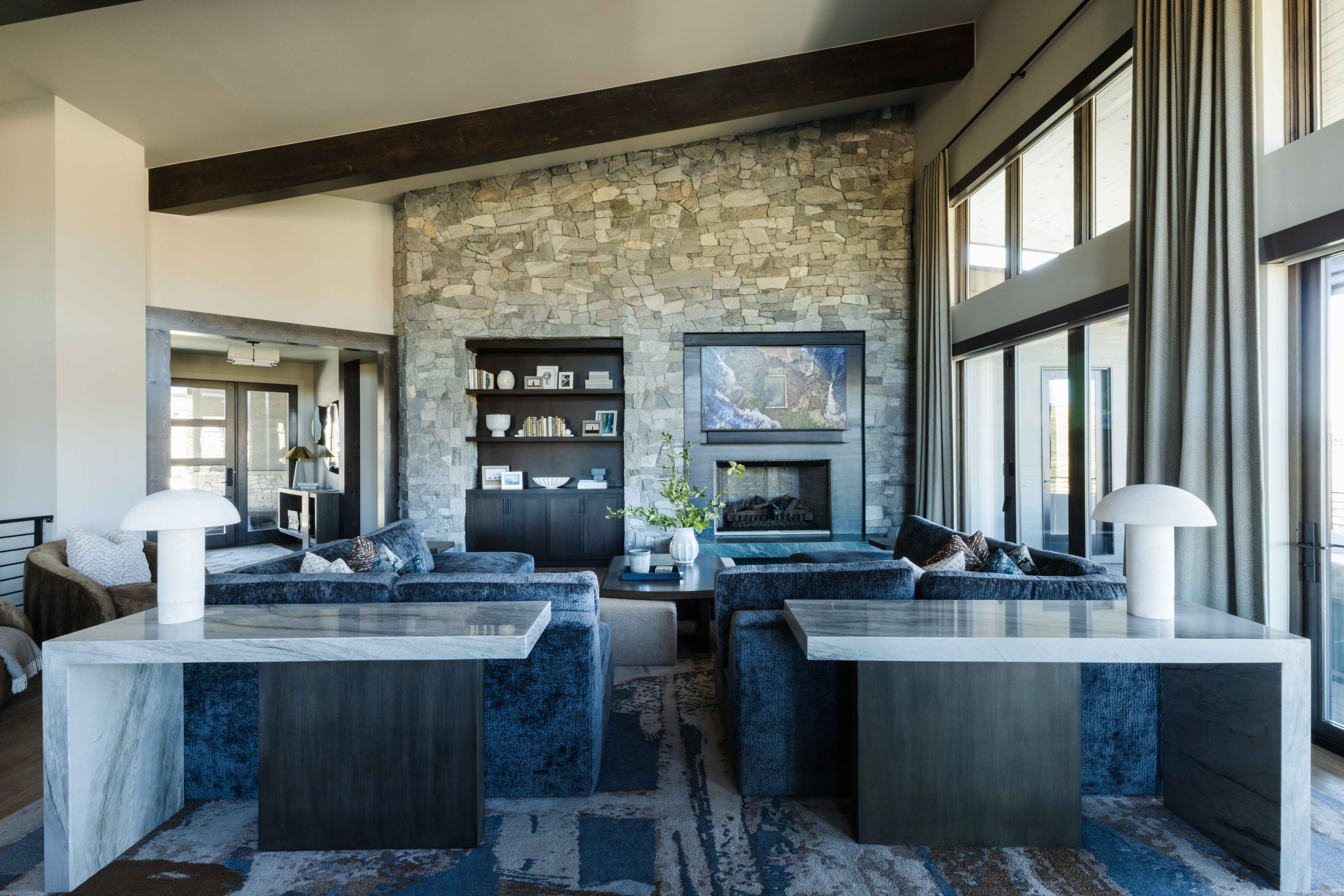 The living area sets the stage for the home, where an unexpected seating arrangement of crushed blue velvet sectionals play off a custom abstract silk and wool rug and rich graphic blue natural-slab fireplace hearth for a striking focal moment. Built-in shelving is thoughtfully styled with a curated collection of books and accessories, while the split seating creates distinct conversation zones without disrupting the open flow. The result is a space that feels artful yet effortlessly livable—a balanced blend of comfort, character, and contemporary elegance.