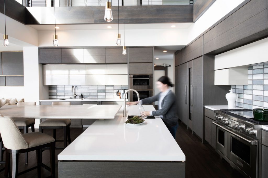 First, come up with a functional space plan with well designed cabinetry and good lighting. Putting function first in a kitchen is a necessity as you want to provide space to be able to move around with ease. Before you start designing the room, walk through it to see what kind of layout would work best for you. Apply the kitchen triangle theory to maximize the flow and diminish traffic within the space. Make sure your stove top, sink, and refrigerator are easily accessible with ample counter space next to them for easy use. There’s no such thing as too much counter space, but be sure to choose a surface that’s easy to work on and care for. Also be sure to provide enough storage space in your cabinets for daily use and maybe even throw in some open shelves to keep the kitchen feeling light and airy! Under cabinet lights that light directly over the counter and under base cabinet lights to light the floor are the best features in making sure your kitchen is well lit for the whole party.