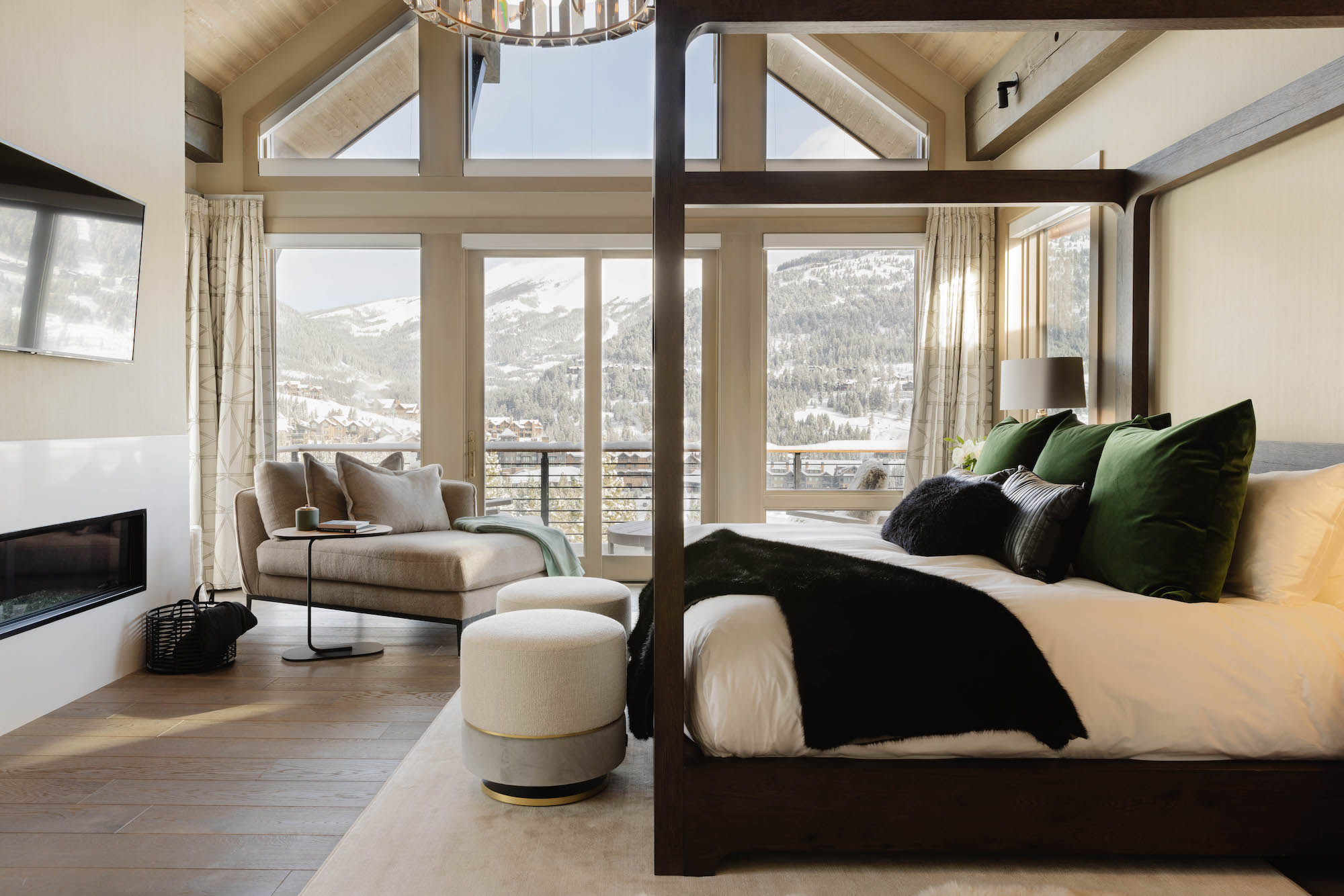 With streams of light pouring in from one side of the palatial home to the other, there’s almost an en plein air quality about the flow of this material-minded ski home. The almost 10,000-square-foot residence boasts a his and her office, a striking open-kitchen design, a cozy outdoor seating area with fireplace, a cherry red bar, and a Dolly Parton-inspired karaoke stage—need we say more?