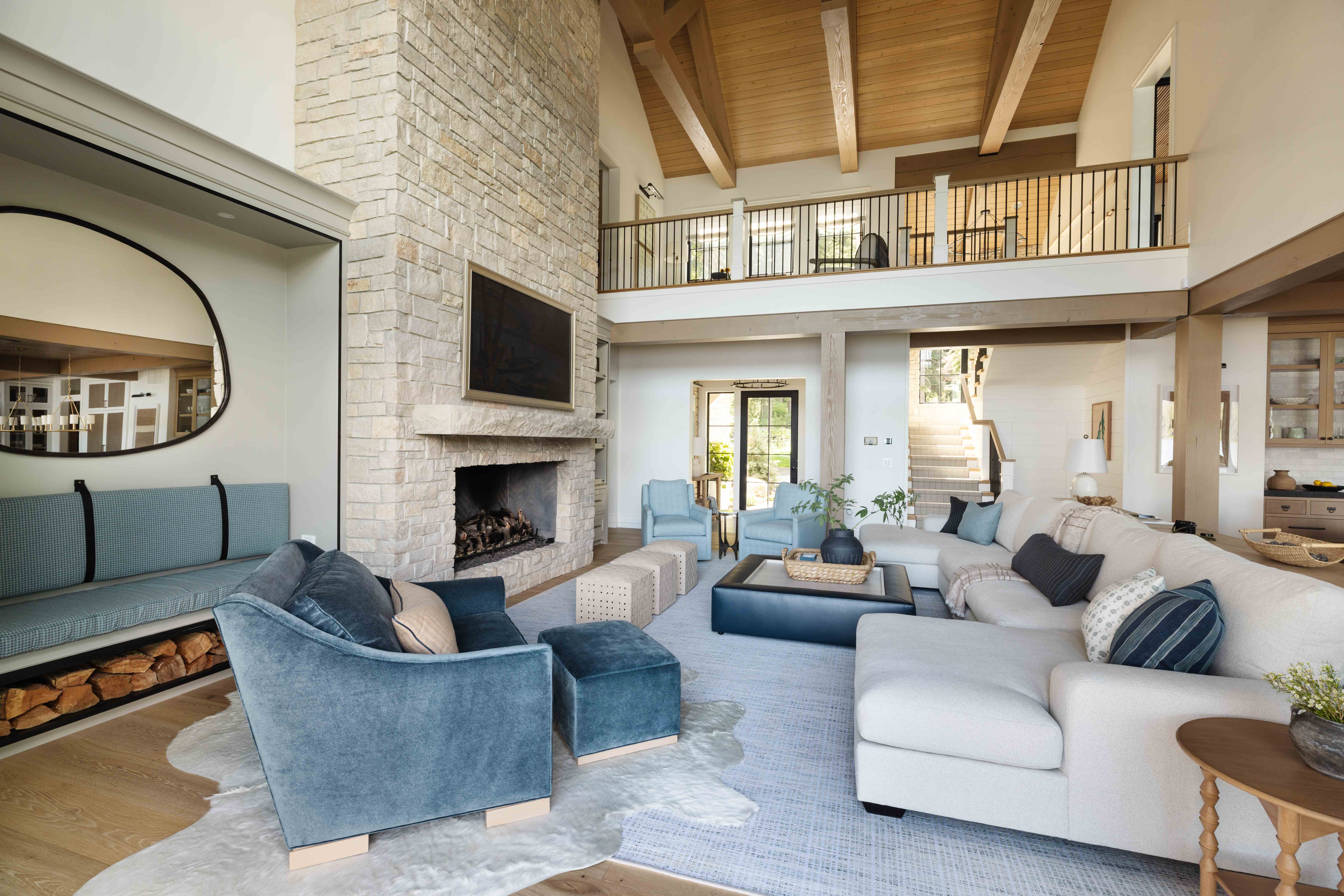 Rooted in warmth and quiet refinement, this thoughtfully designed retreat balances rustic architectural details with tailored, livable luxury. Soaring wood-beamed ceilings, textural stone fireplaces, and layered neutrals set the tone, while soft blues and earthy hues echo the surrounding landscape. From the welcoming kitchen and gathering spaces to intimate bedrooms and cozy sitting areas, each room flows effortlessly into the next—creating a relaxed yet elevated backdrop for hosting, unwinding, and savoring lake days year-round.